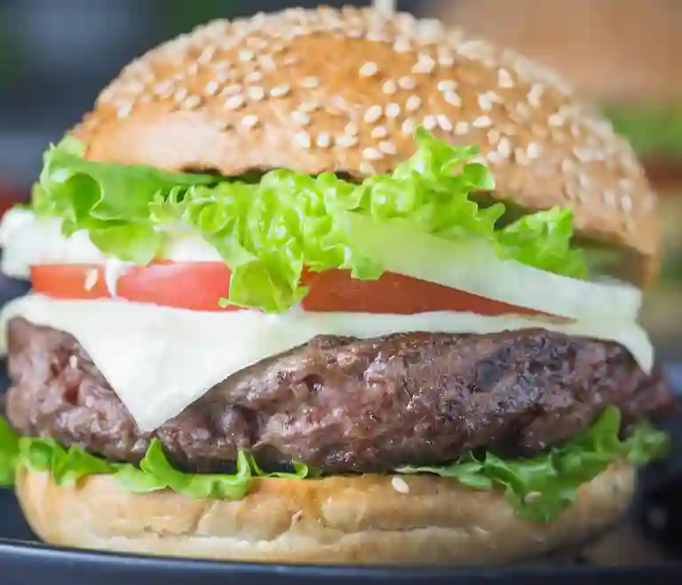Carne hamburguesa, lechuga fresca, tomate, cebolla y salsa de la casa