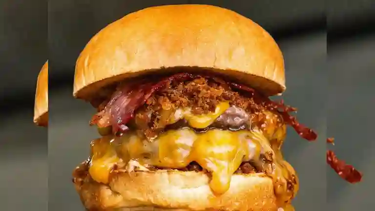 Beef 200g, pan de papa, queso Colby Jack, cebolla crispy, tocineta, miel de maple y dip Carmelo.
