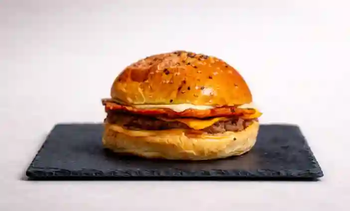 2 carne artesanal, tomate, pepinillos, queso, tocineta y salsa de la casa.