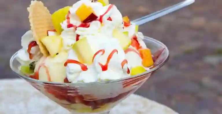 Ensalada de frutas con papaya, mango, manzana, fresa, uva, banano, queso, crema de leche, 2 bolas de helado a elección, lechera, galletas, mermelada y salsa de chocolate.