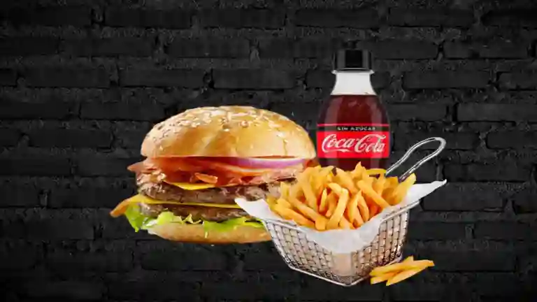 Jugosa hamburguesa con triple carne 100 res, tocineta ahumada, queso mozzarella, salsa de queso cheddar, bbq jack daniel's , sobre una cama de lechuga, tomates, cebolla, en un rico pan artesanal, acompañada de papas a la francesa y coca-cola.