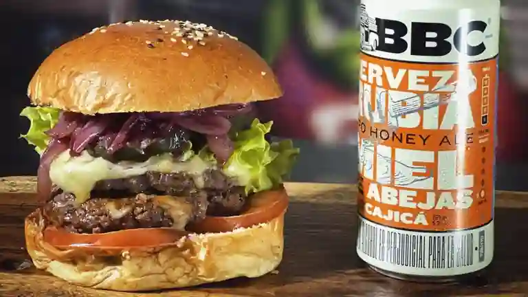 Hamburguesa con carne de res de 400 gr, costilla, huevo, plátano maduro, maíz, queso americano, tomate, lechuga, cebolla caramelizada y pan artesanal.