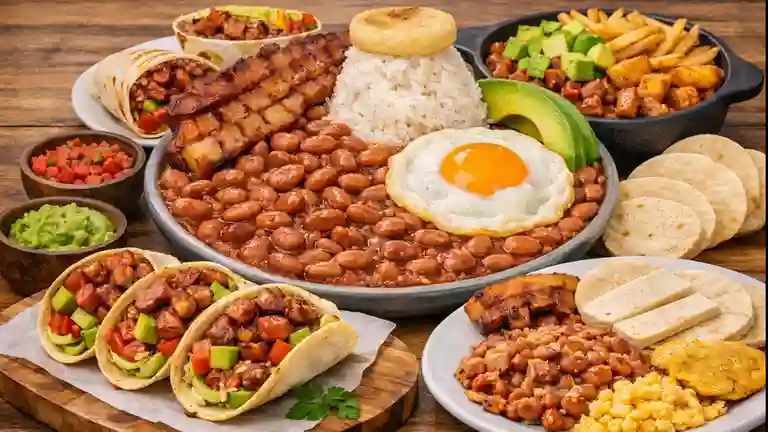 Desayuno montañero con calentado de frijoles y arroz, chicharrón, huevos revueltos, arepa y queso.