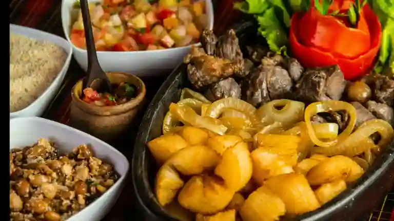 Selección de proteina, arroz, tajada de maduro o papas fritas, selección de ensalada (cebolla y tomate, lechuga, remolacha, mixta), selección de sopa (del dia, pescado, mondongo o frijol), selección de bebida (jugo del dia, claro o guarapo).
