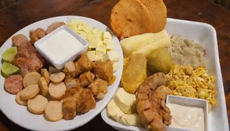 Desayuno con 300 g de chicharrón, arepa dulce, huevos pericos, chorizo, queso, yuca, suero y manguito biche.