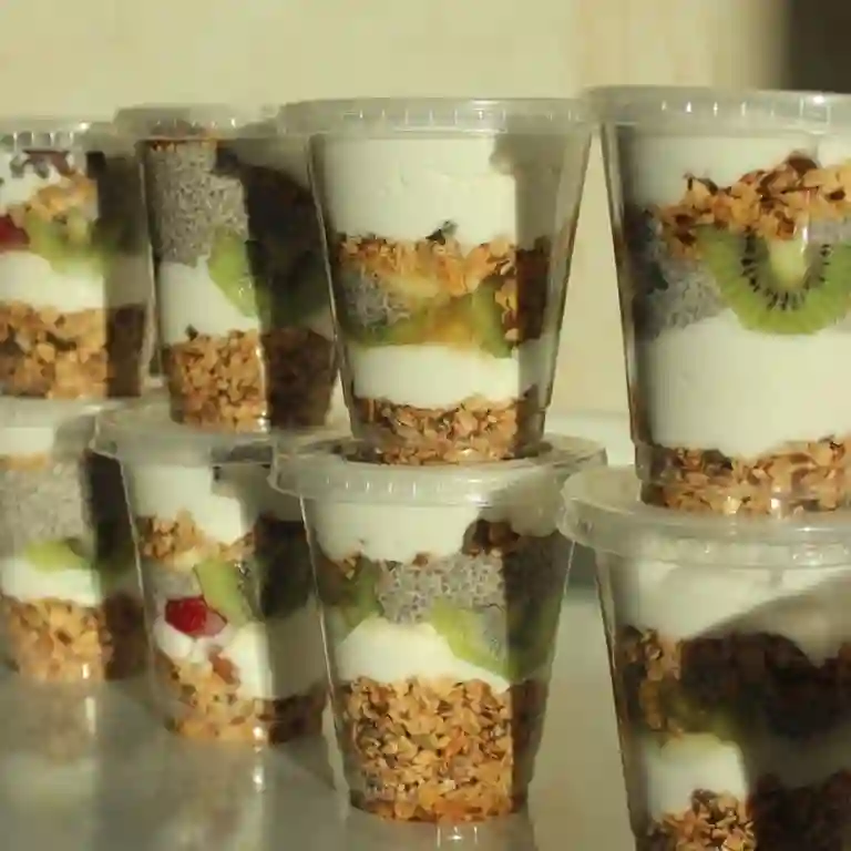 en vaso de 9oz, ingrediente: yogur griego, kéfir y semillas de chía mermelada fresa, mango, maracuyá, piña, plátano grabola sin azúcar avena en hojuela Ingredientes adicionales opcionales