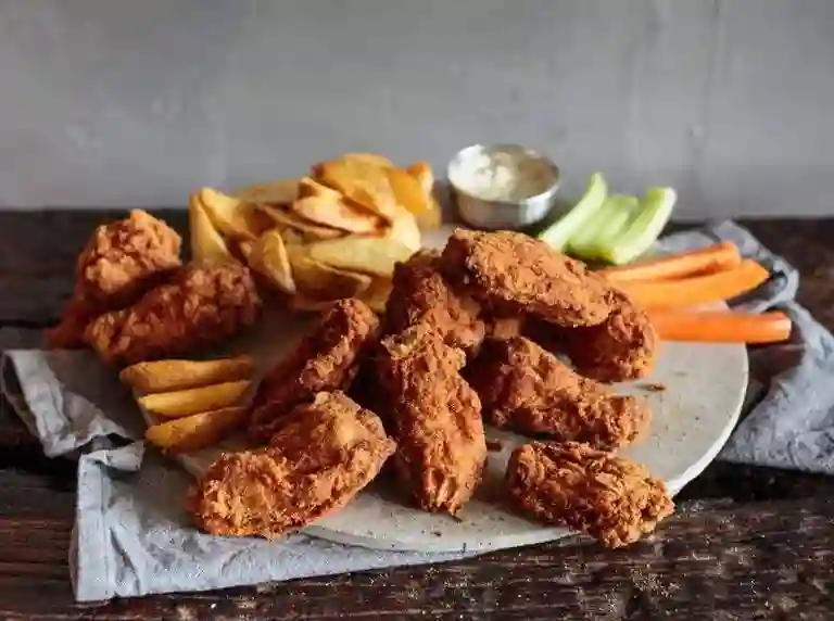 Trozos de pechuga apanados acompañados con apio, zanahoria, salsa de queso azul y acompañante a elección. escoge tu salsa.