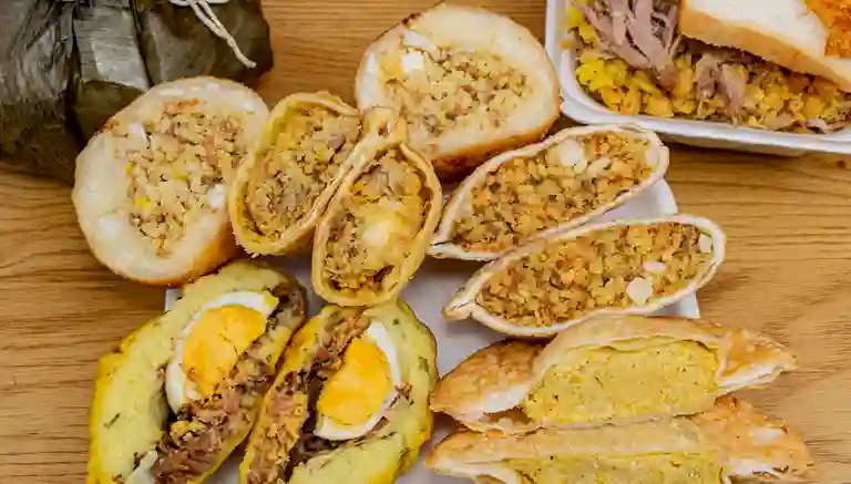 Tamal tolimense de masa de maíz con carne, arroz, arveja y sazón tradicional colombiano envuelto en hoja de plátano.