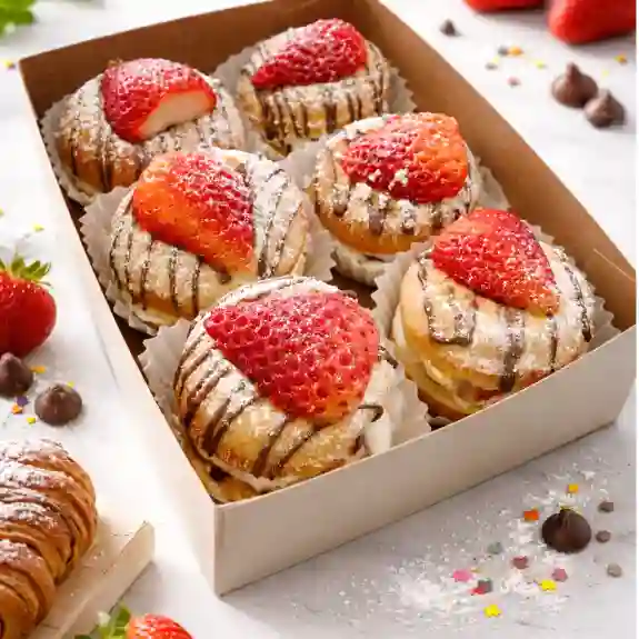 Mini donas de vainilla suaves, rellenas de fresa y chantilly, con toque de chocolate.