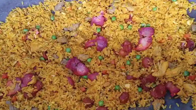 Arroz, Pollo, Cerdo, Chorizo, Chicharrón, Maduro, Verduras.