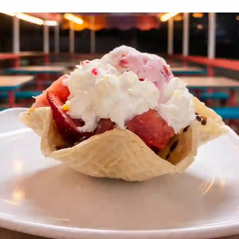 2 bolas de helado, chantilly, barquillo, cereza, salsas de preferencia