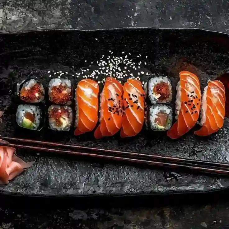 Salmón fresco, anguila, aguacate, queso crema, salsa de anguila y salsa ponzu.